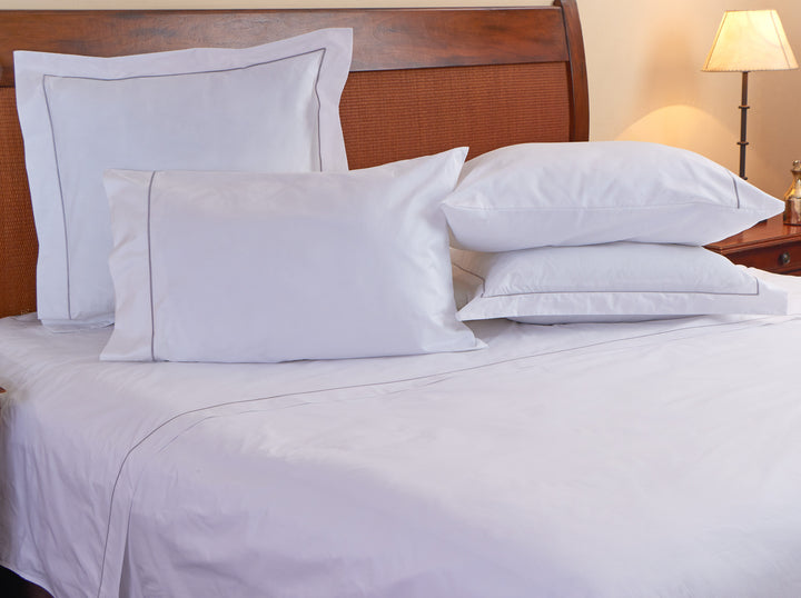 Set de Sábanas elegantes 100% algodón de 200 hilos, hipoalergénico con línea bordada color gris.